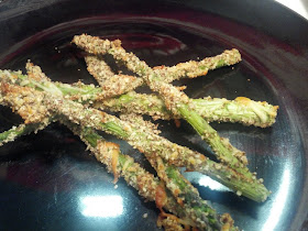 Dip the asparagus spears into the egg, and then roll in the dry ingredients, and place on a tin foil lined baking sheet. I added a liiittle more parmesan cheese to the tops of them right before I put them in the oven.